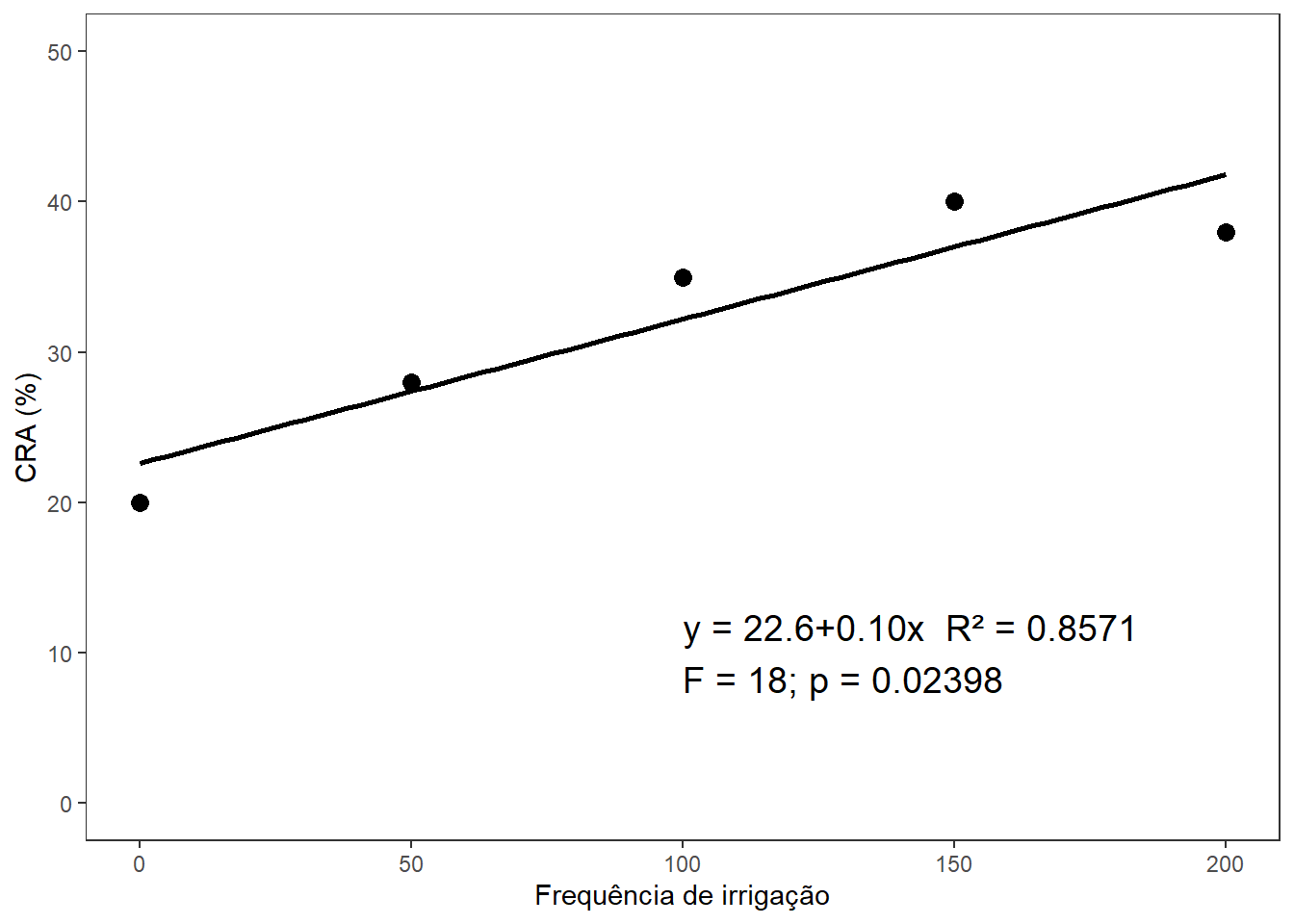 dose <-c(0, 50, 100, 150, 200)prod <-c(20, 28, 35, 40, 38)dados_reg <-data.frame(dose, prod)modelo_reg <-lm(prod ~ dose, data = dados_reg)a <-summary(modelo_reg)# Coeficientescoeficientes <-coef(modelo_reg)intercepto <-round(coeficientes[1], 2) # sem sinal extraslope <-formatC(coeficientes[2], format ="f", digits =2, flag ="+") # sempre com sinal# Estatísticas do modelor2 <-round(a$r.squared, 4)f_value <- a$fstatistic[1]df1 <- a$fstatistic[2]df2 <- a$fstatistic[3]p_value_anova <-pf(f_value, df1, df2, lower.tail =FALSE)# Equação no formato corretoequacao <-paste0("y = ", intercepto, slope, "x")legenda <-paste0( equacao," R² = ", r2,"\nF = ", f_value,"; p = ", format.pval(p_value_anova, digits =4, eps =0.001))dados_reg |>ggplot(aes(x = dose, y = prod)) +geom_point(size =3) +geom_smooth(method ="lm", se =FALSE, color ="black") +annotate("text",x =100, y =10,label = legenda,hjust =0, size =5) +labs(x ="Frequência de irrigação", y ="CRA (%)") +theme_bw() +theme(panel.grid =element_blank()) +ylim(0, 50)